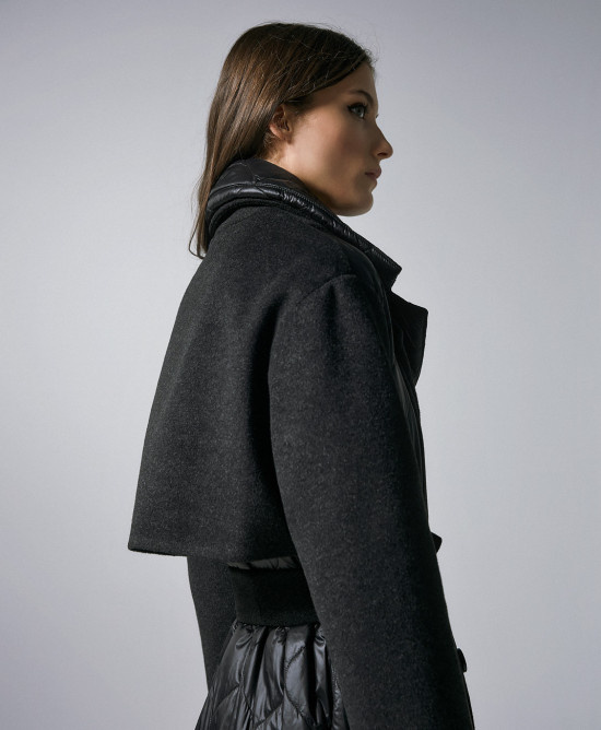 Long quilted coat made from a combination of fabrics, featuring a notched lapel collar and side pockets. Designed with belt loops, a detachable tie belt, and a front button fastening. An ideal choice for stylish all-day looks.