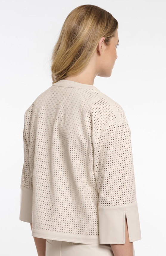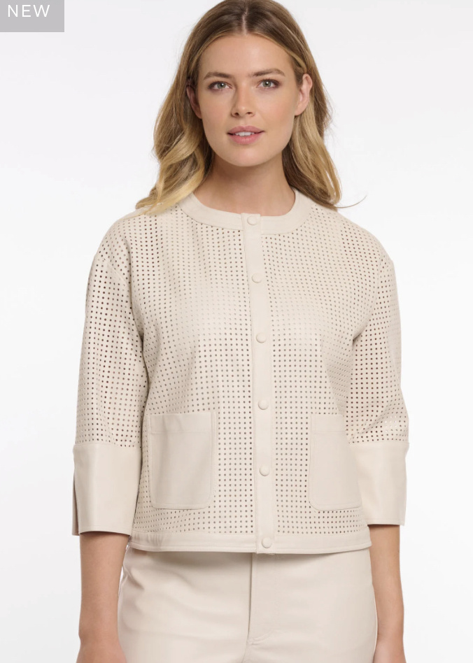 A statement in modern sophistication, this perforated faux leather jacket combines airy detailing with a structured shape for an elevated touch. Designed with a sleek button closure, two front pockets, and subtle sleeve slits, it balances functionality wi