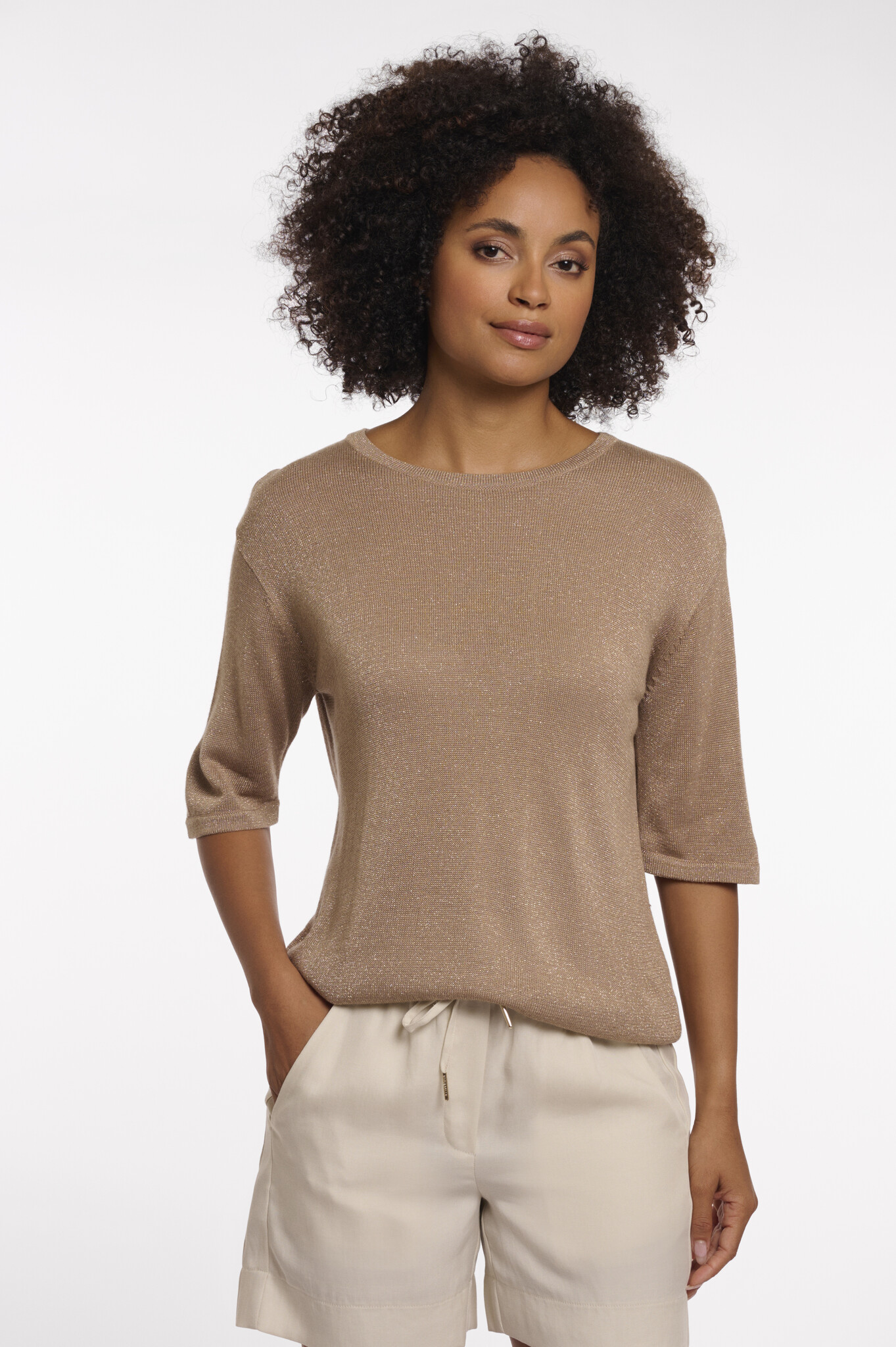 A lightweight knit top with a subtle shimmer woven through, catching the light in an understated way. The straight fit, half-length short sleeves and refined crew neckline give it a timeless silhouette.