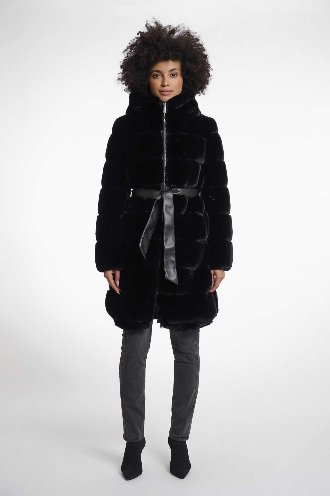 Get comfortable and warm with this super soft faux-fur coat with faux leather details. This cozy coat features a two-way zipper with an adjustable waistbelt and a soft hood.