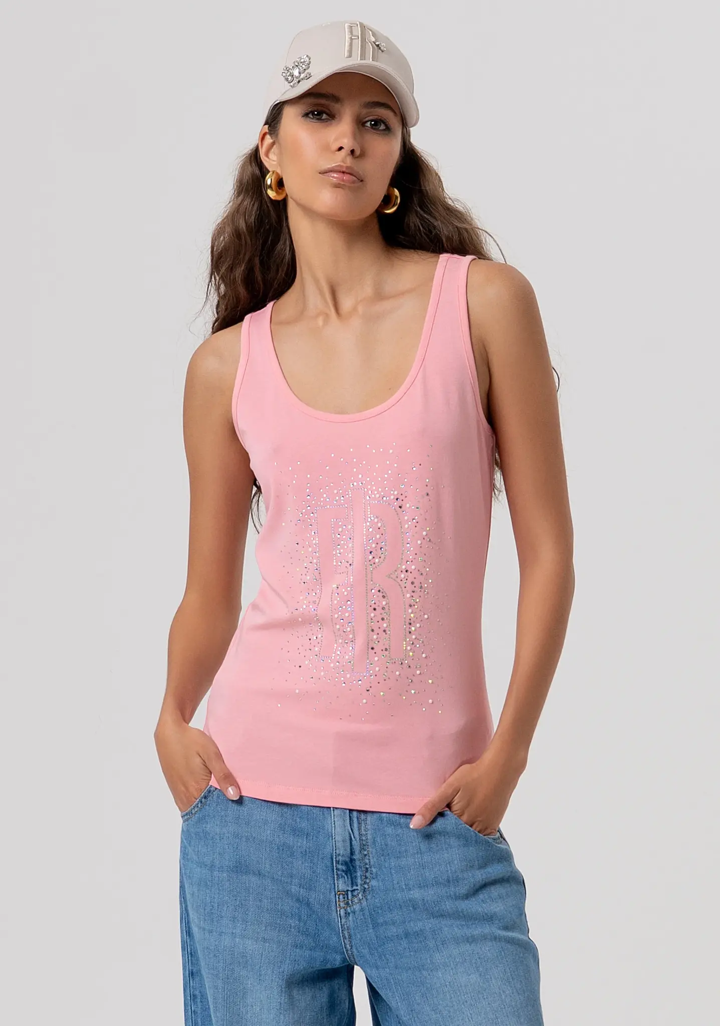 • Tank top made in cotton jersey. Wide round neck and logo with strasses on the front