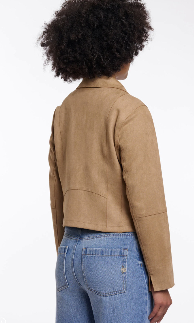 Step into timeless elegance with this faux suede biker jacket, crafted from a soft-touch fabric that blends comfort with refined edge. Designed with an asymmetric front zipper, two vertical zip pockets, and classic notched lapels, it captures the essence