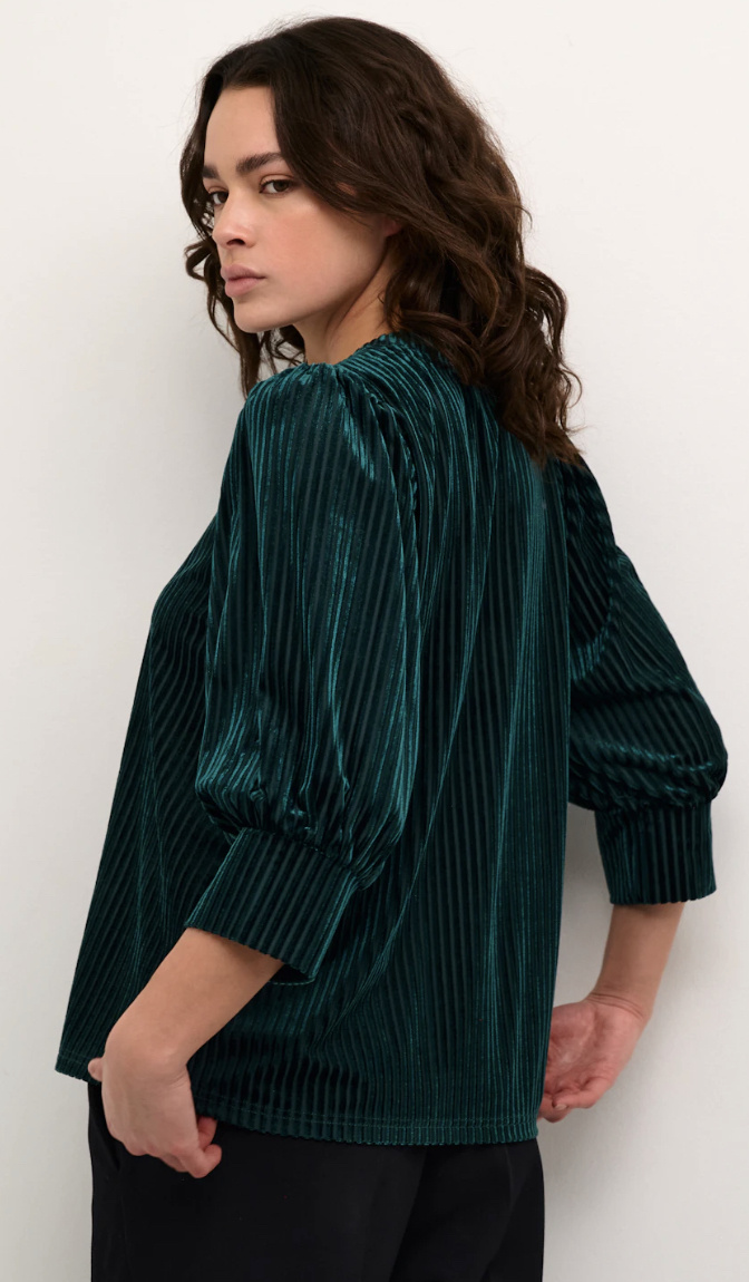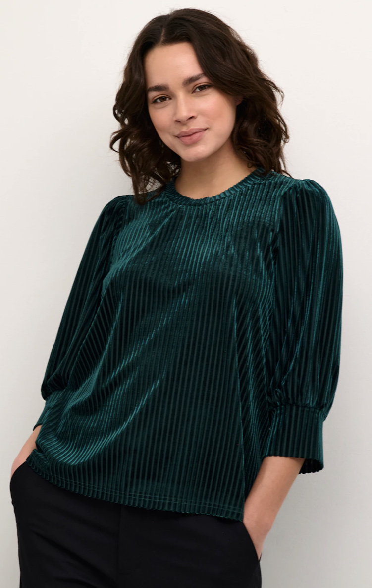 Striped velvet blouse with a straight silhouette, round neckline, softly gathered 3/4 sleeves, and wide cuffs. Subtle texture and relaxed, polished look.