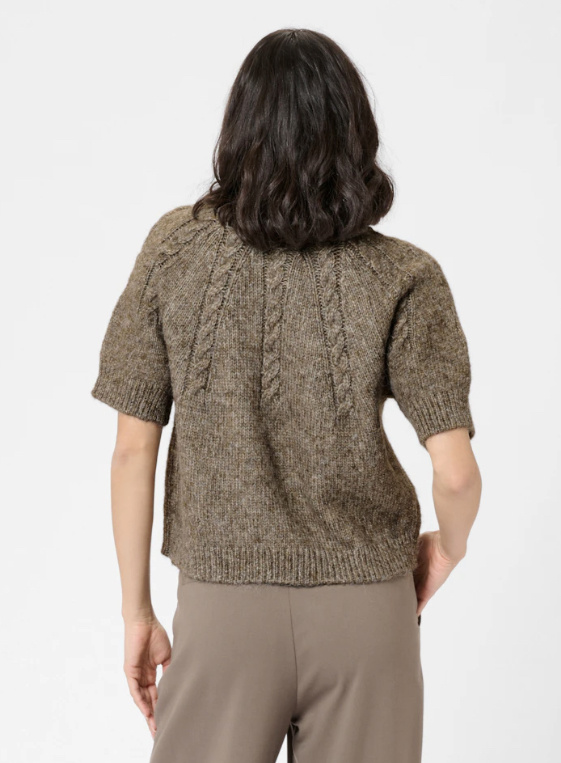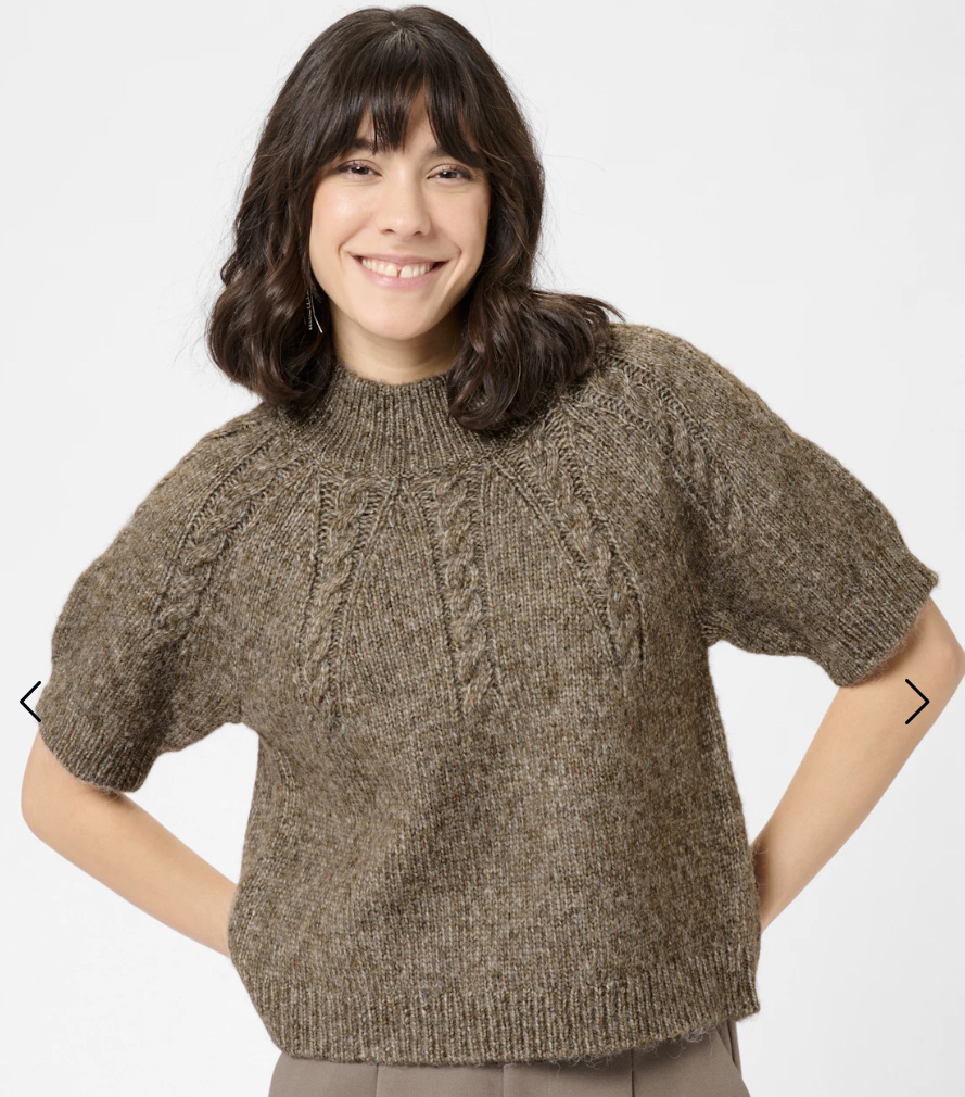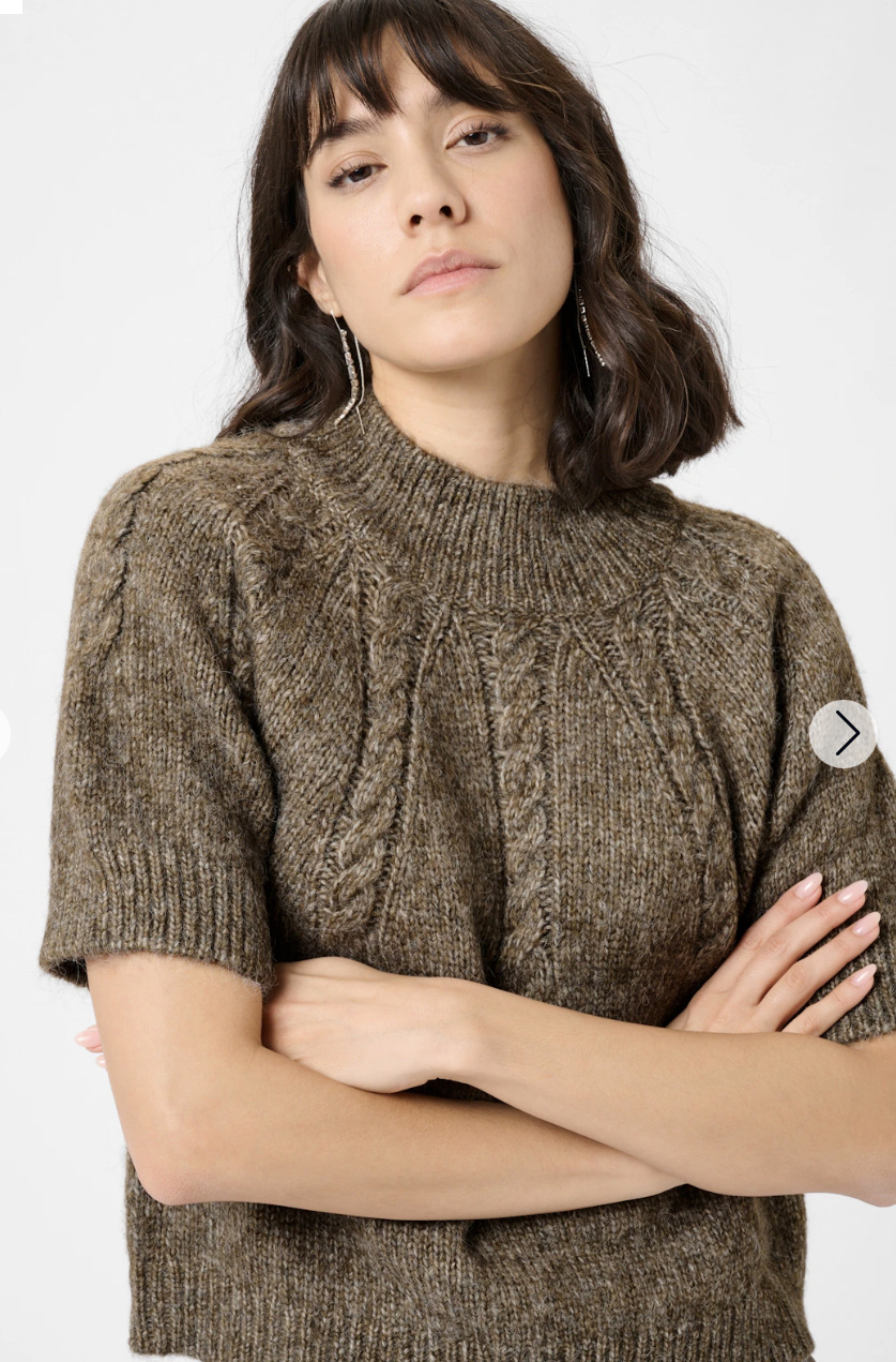 This cable knit jumper features a boxy silhouette, mock neck, and short sleeves. The textured finish and ribbed trims elevate its comfortable fit.