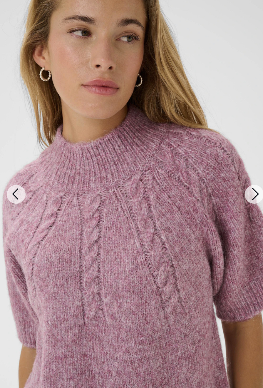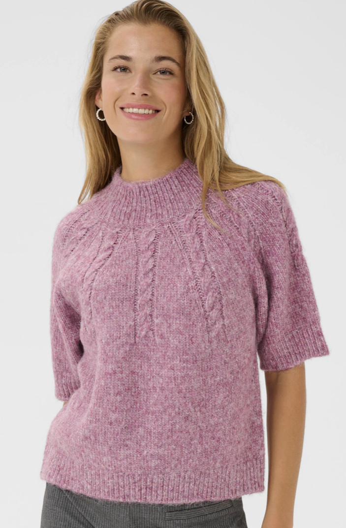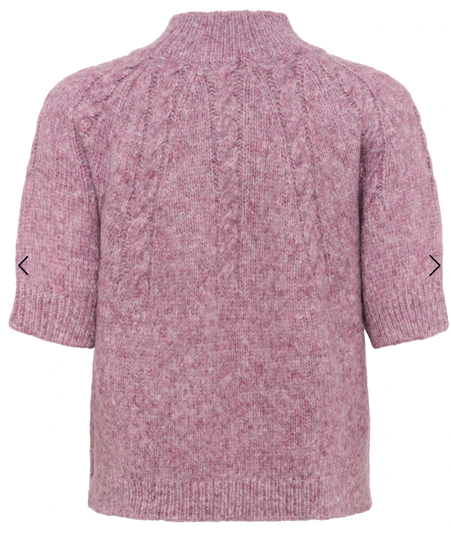 This cable knit jumper features a boxy silhouette, mock neck, and short sleeves. The textured finish and ribbed trims elevate its comfortable fit.