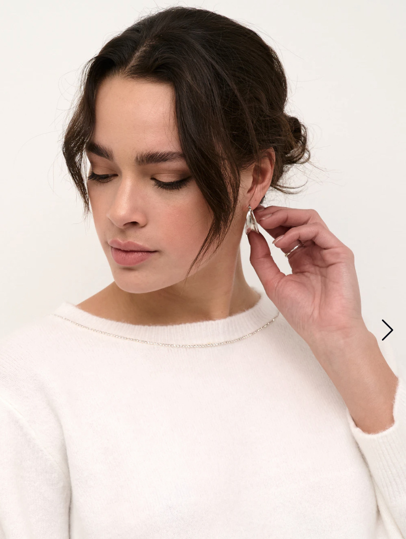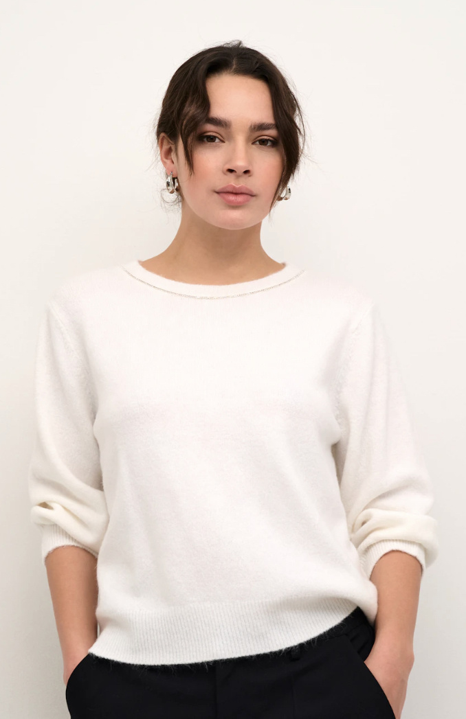 Sweater with a straight silhouette, soft finish, classic crew neckline with subtle embellishment. Features relaxed gathered sleeves and ribbed cuffs for understated style.