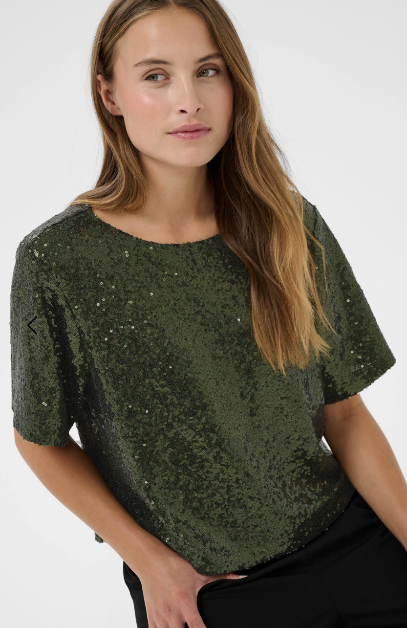 Sequin top with boxy silhouette and short sleeves. Features a crew neckline and cropped length, fully covered in shimmering sequins for an eye-catching effect.