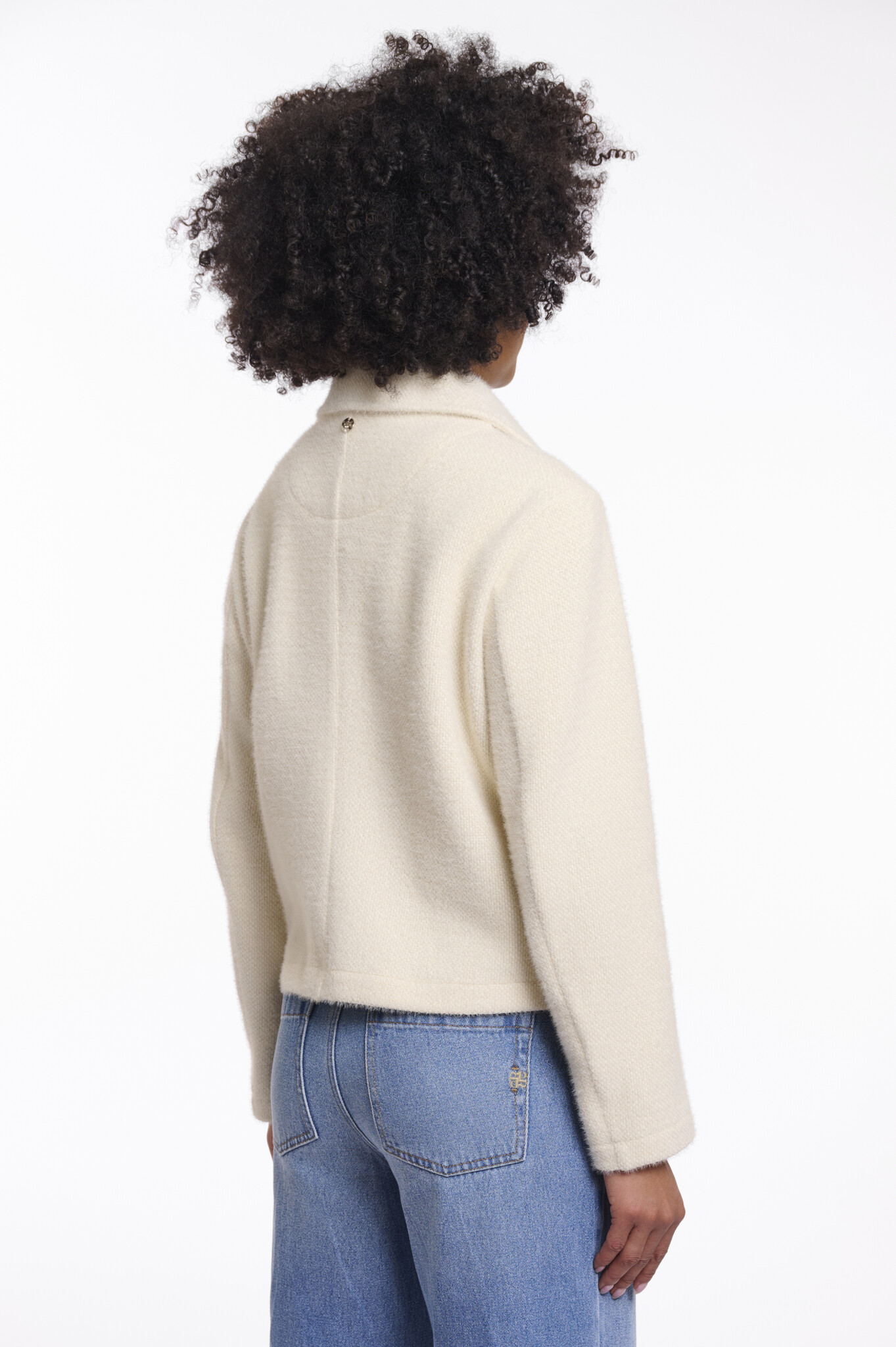 Wrap yourself in effortless sophistication with this softly textured knitted jacket, crafted from a soft fabric for a cozy yet refined feel. Designed with a clean hidden button closure, two generous front pockets, and a classic collar, it offers a polished take on everyday layering. The straight silhouette makes it an easy, versatile piece to style over both relaxed and tailored looks.