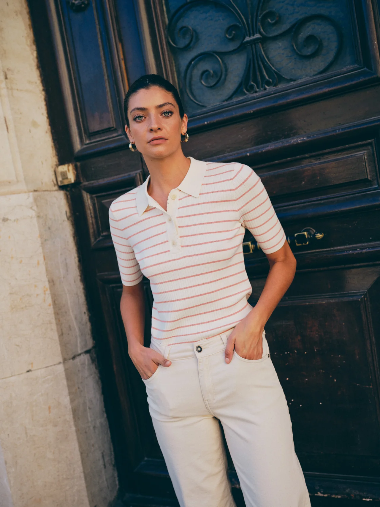 A refined take on the classic polo. This soft, striped knit is designed in a regular fit with short sleeves, a classic collar, and button placket. The fine knit texture and subtle sheen give it a timeless, feminine look. Pair it with jeans or tailored trousers for effortless everyday elegance.