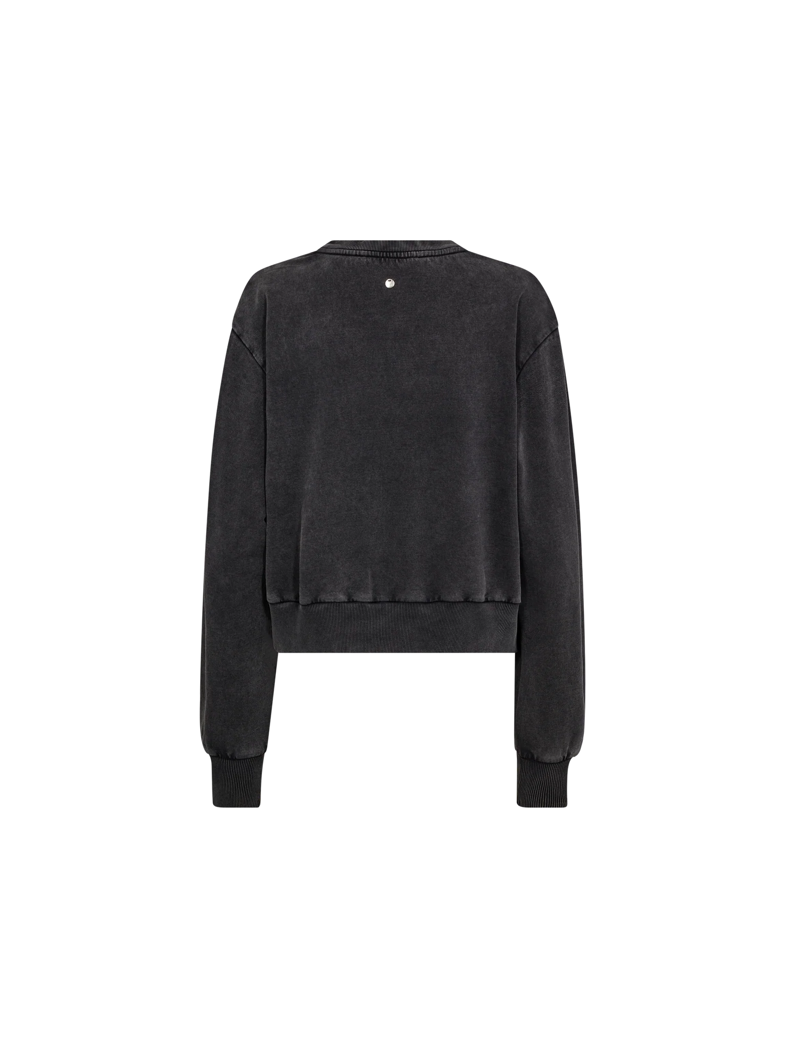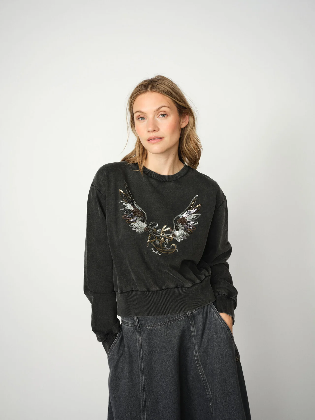 Make a statement with this effortlessly cool sweatshirt, designed in a loose fit for a relaxed yet stylish silhouette. Featuring ribbed details at the neckline, cuffs, and hem, it ensures both comfort and a structured look. The bold rock’n’roll print at the front, highlighted by shimmering sequin details, adds an edgy touch—perfect for pairing with jeans or leather pants for a rebellious and chic outfit.
