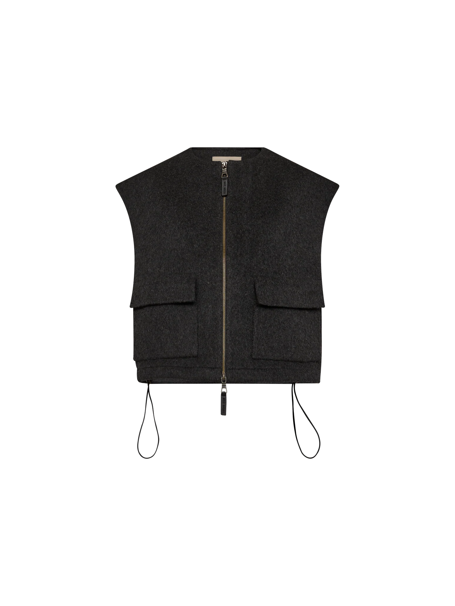 Stay stylish and warm with this chic mélange wool vest, designed for effortless layering. The zipper closure and adjustable drawstrings at the hem ensure a perfect fit while adding a modern touch. Featuring practical flap pockets, this vest is a versatile addition to any wardrobe, seamlessly blending function with contemporary style.