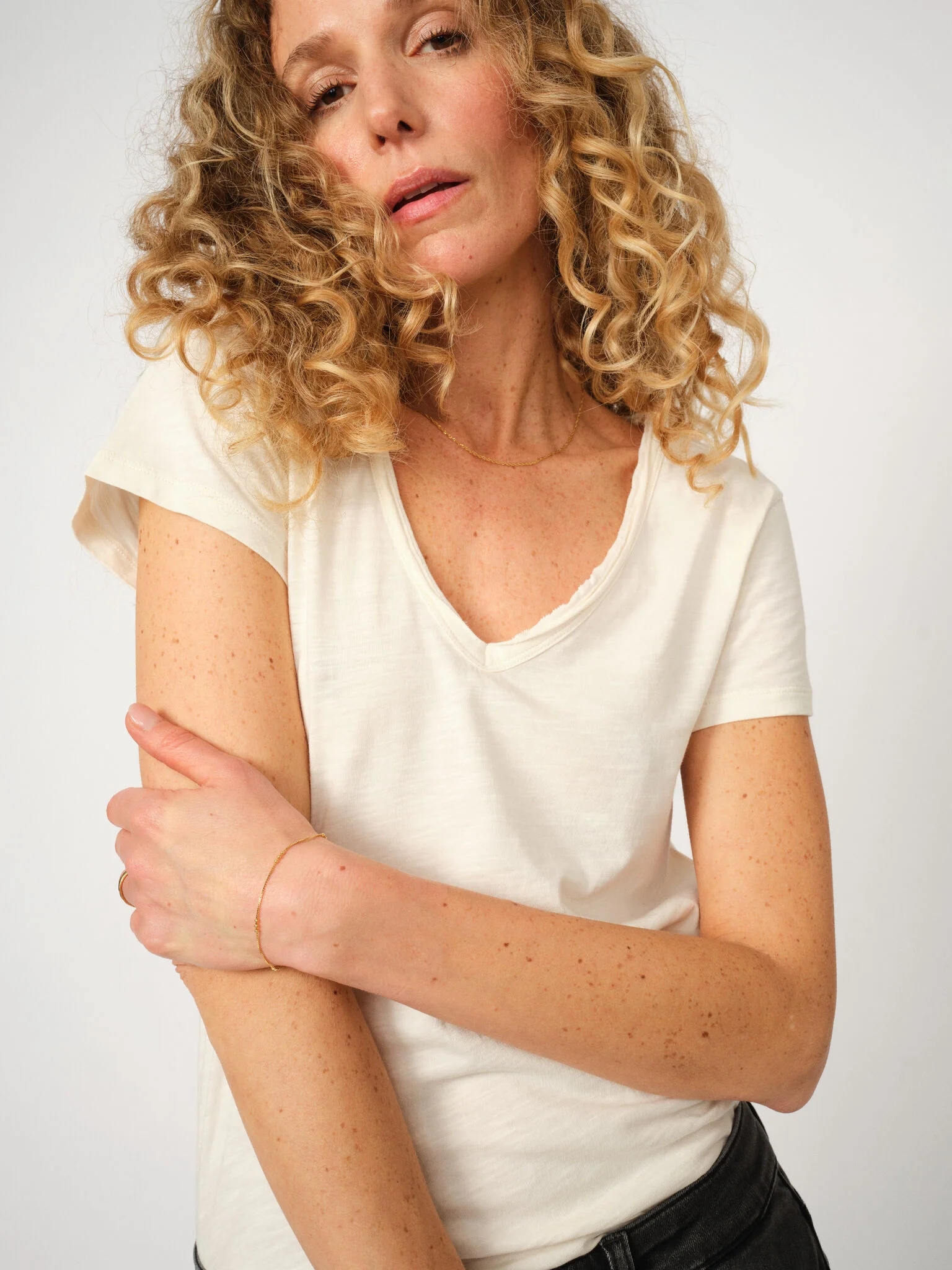 A timeless everyday essential, this soft V-neck tee is designed in a fitted silhouette that flatters the figure beautifully. The smooth texture and classic cut make it perfect for layering or wearing solo. Pair it with jeans for a casual look or tuck it into tailored pants for effortless sophistication.
