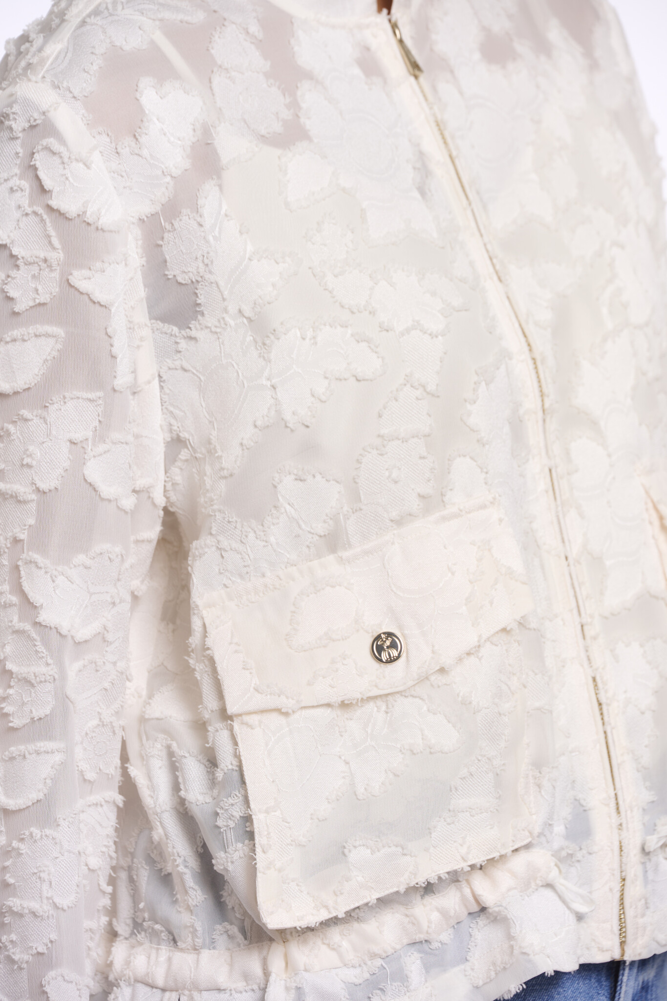 Elevate your look with this lightweight printed jacket, featuring a subtle floral pattern and a slightly sheer finish for an elegant, airy touch. Designed with a sleek zipper closure and two patch pockets with buttoned flaps, it blends modern utility with feminine ease. The adjustable drawstring hem allows you to shape the fit, making it a versatile piece for refined, contemporary styling.