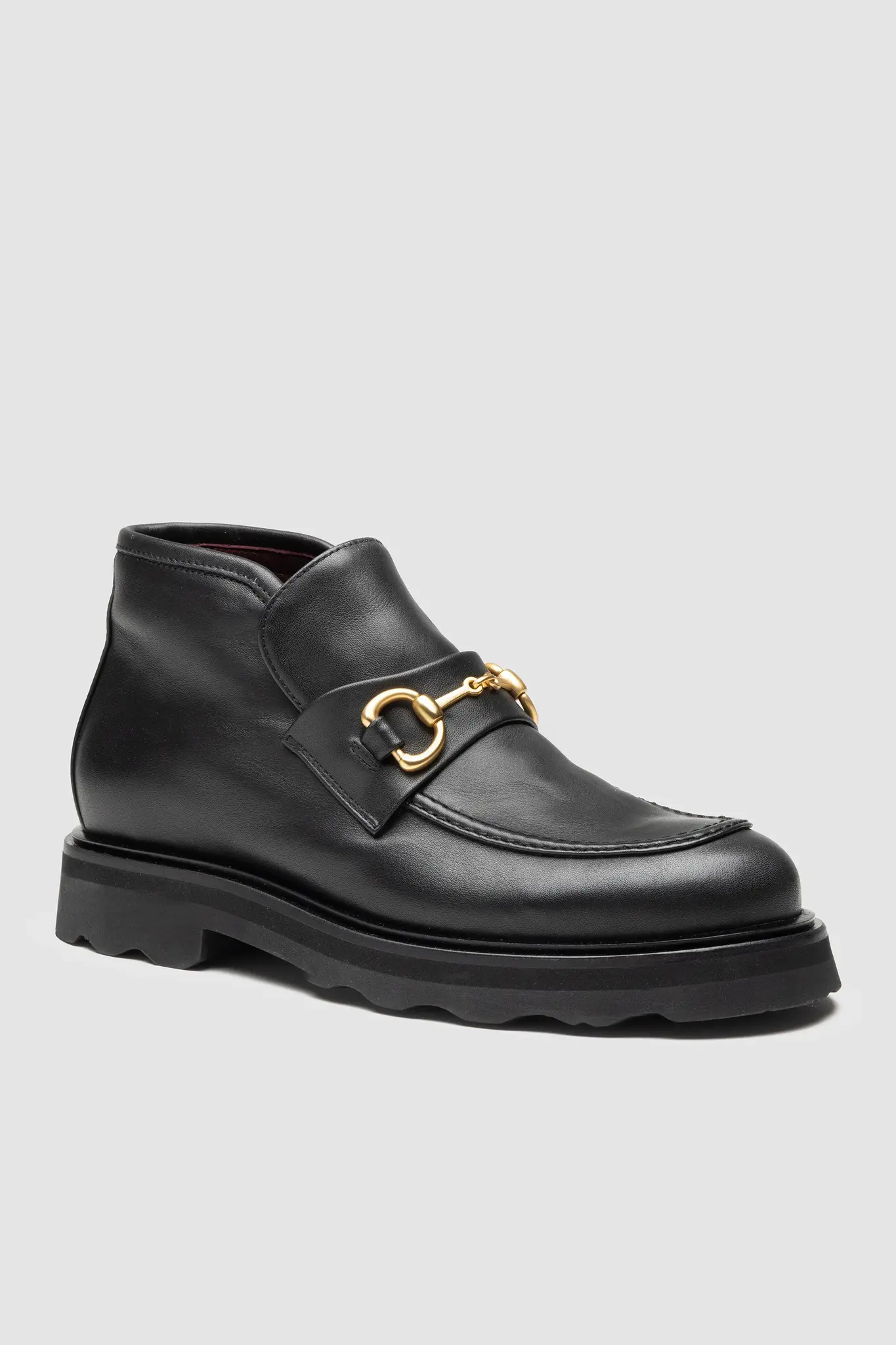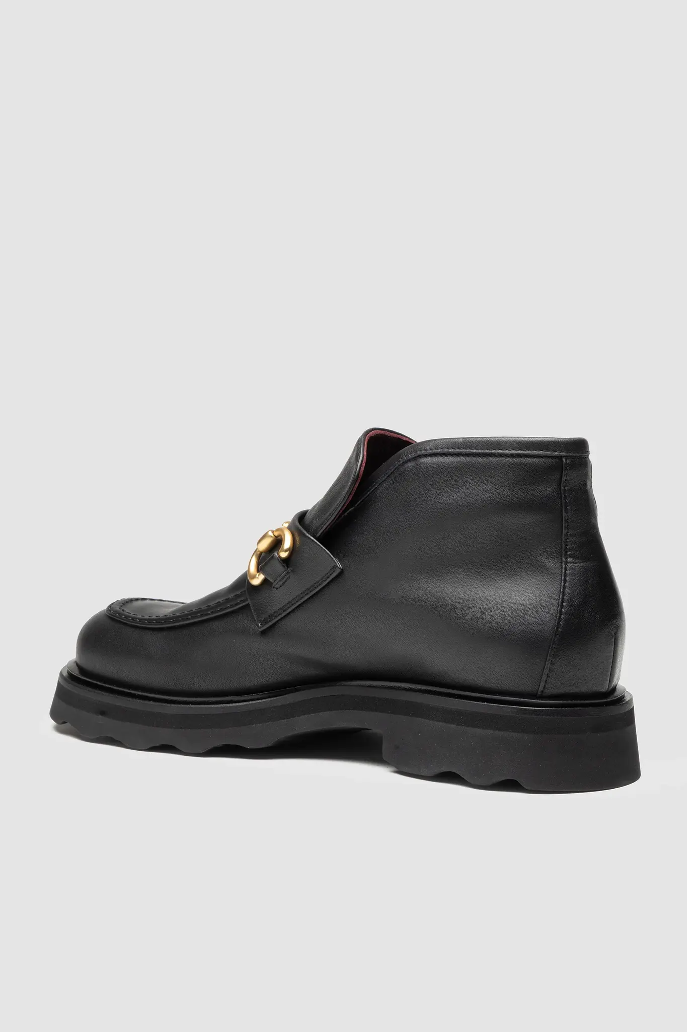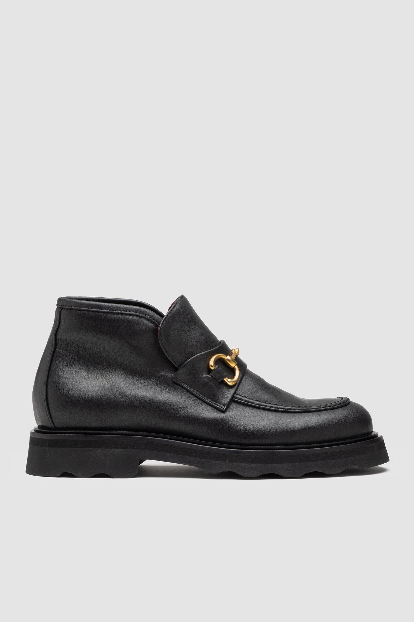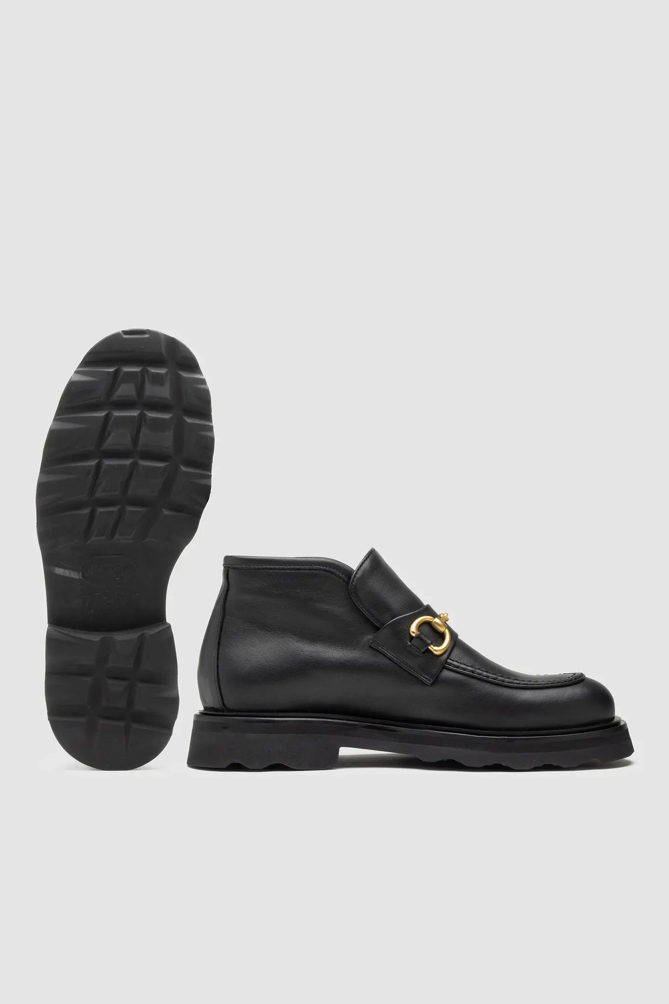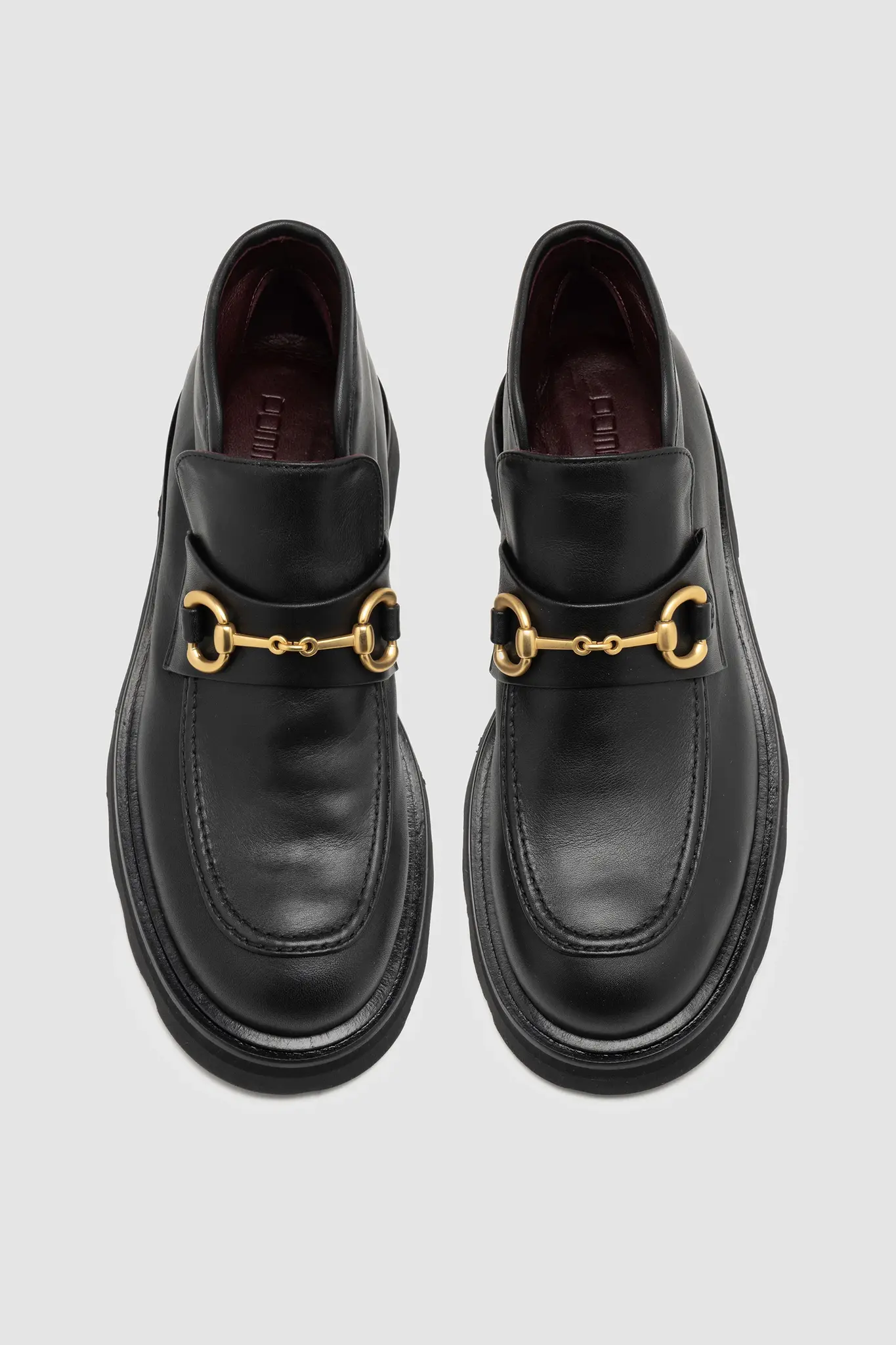 Black leather loafer, featuring a brass-colored metal buckle, soft leather lining, and a rubber lug sole.