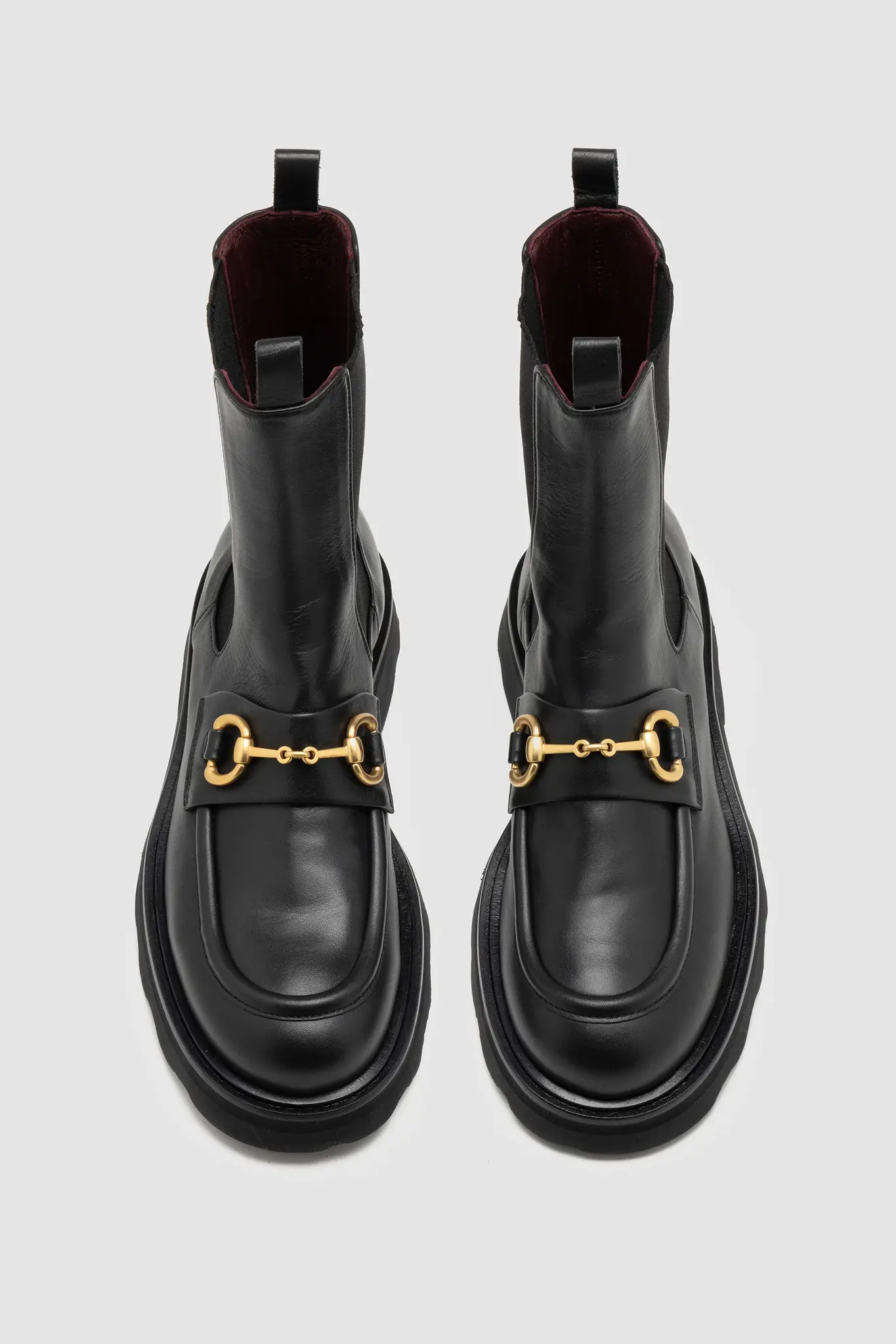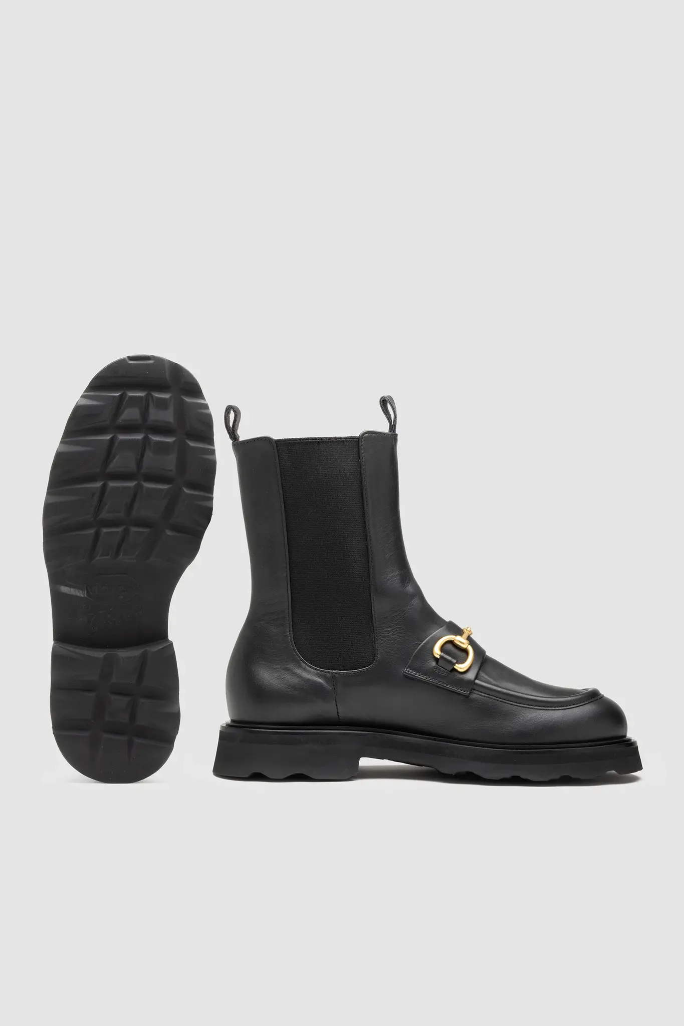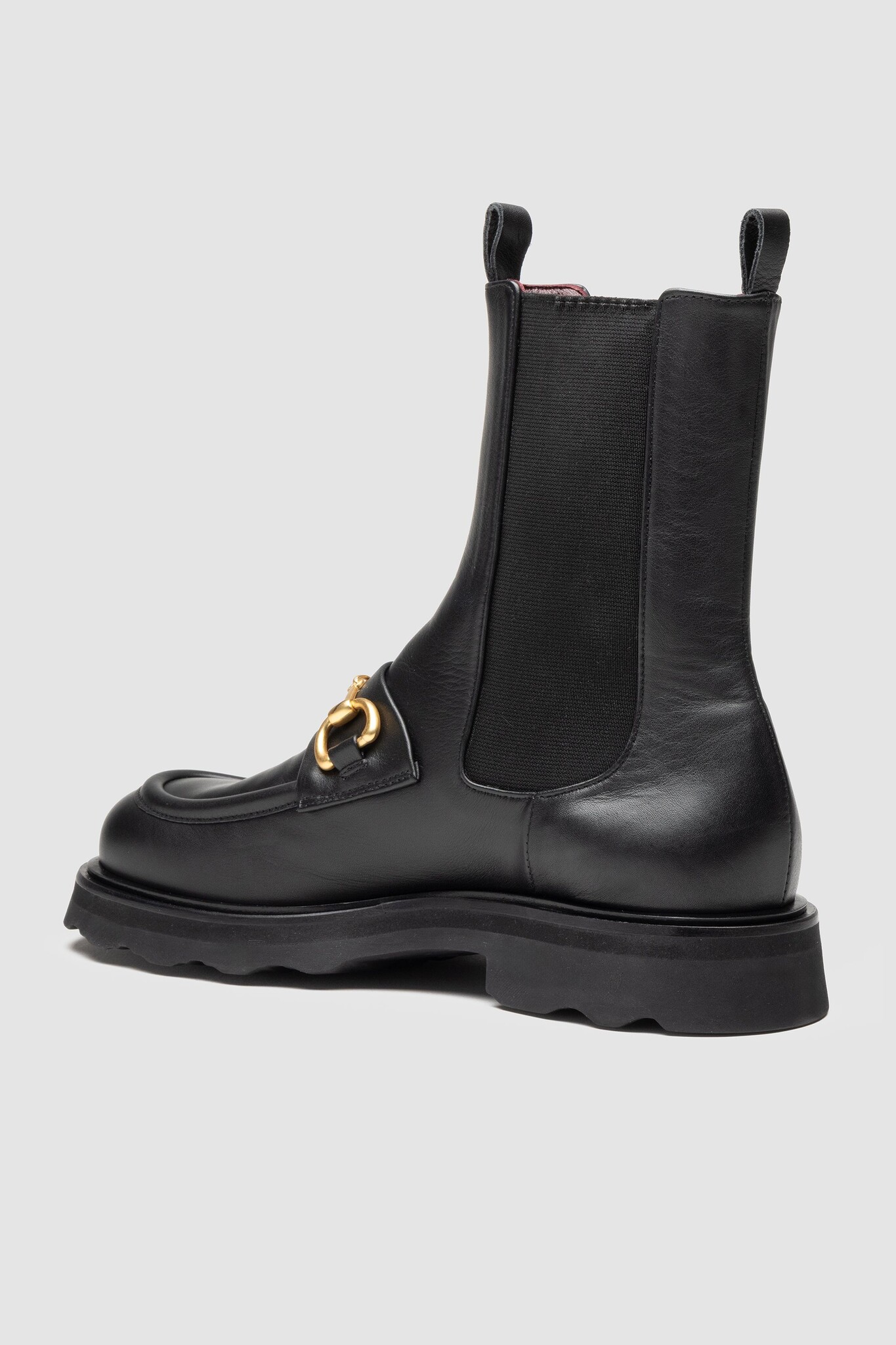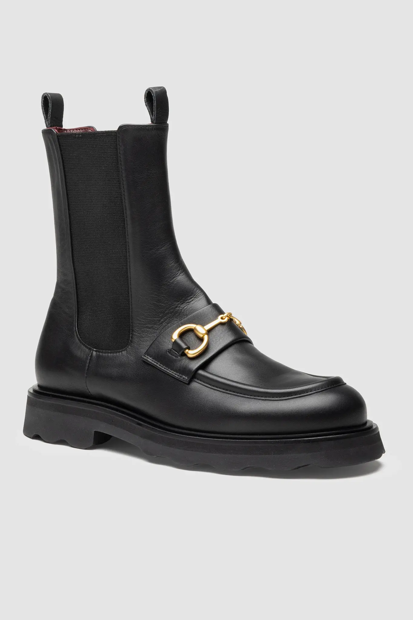 Black lether loafer with side stretch fabirc, featuring a brass-colored metal buckle, soft leather lining, and a rubber lug sole.