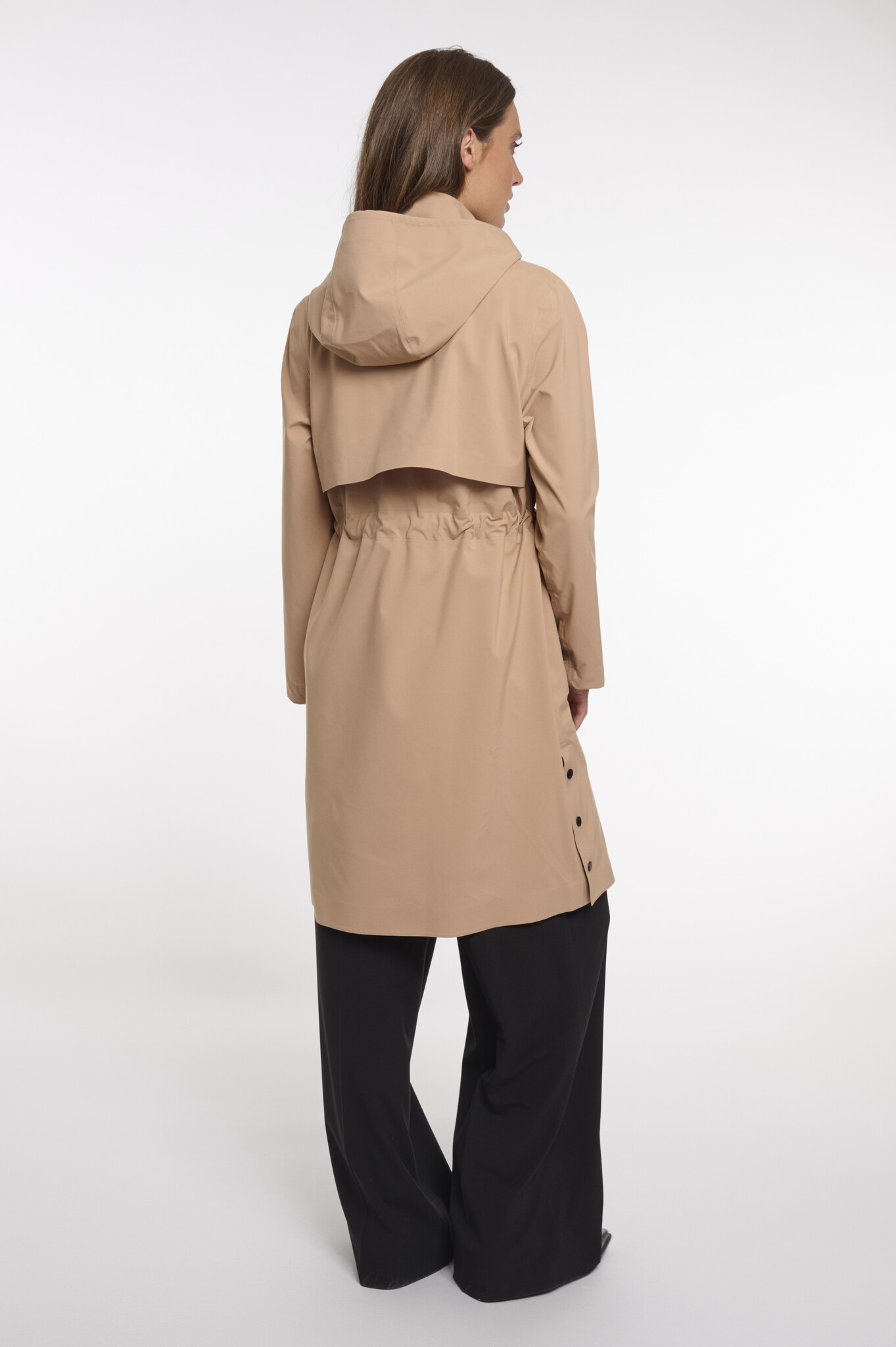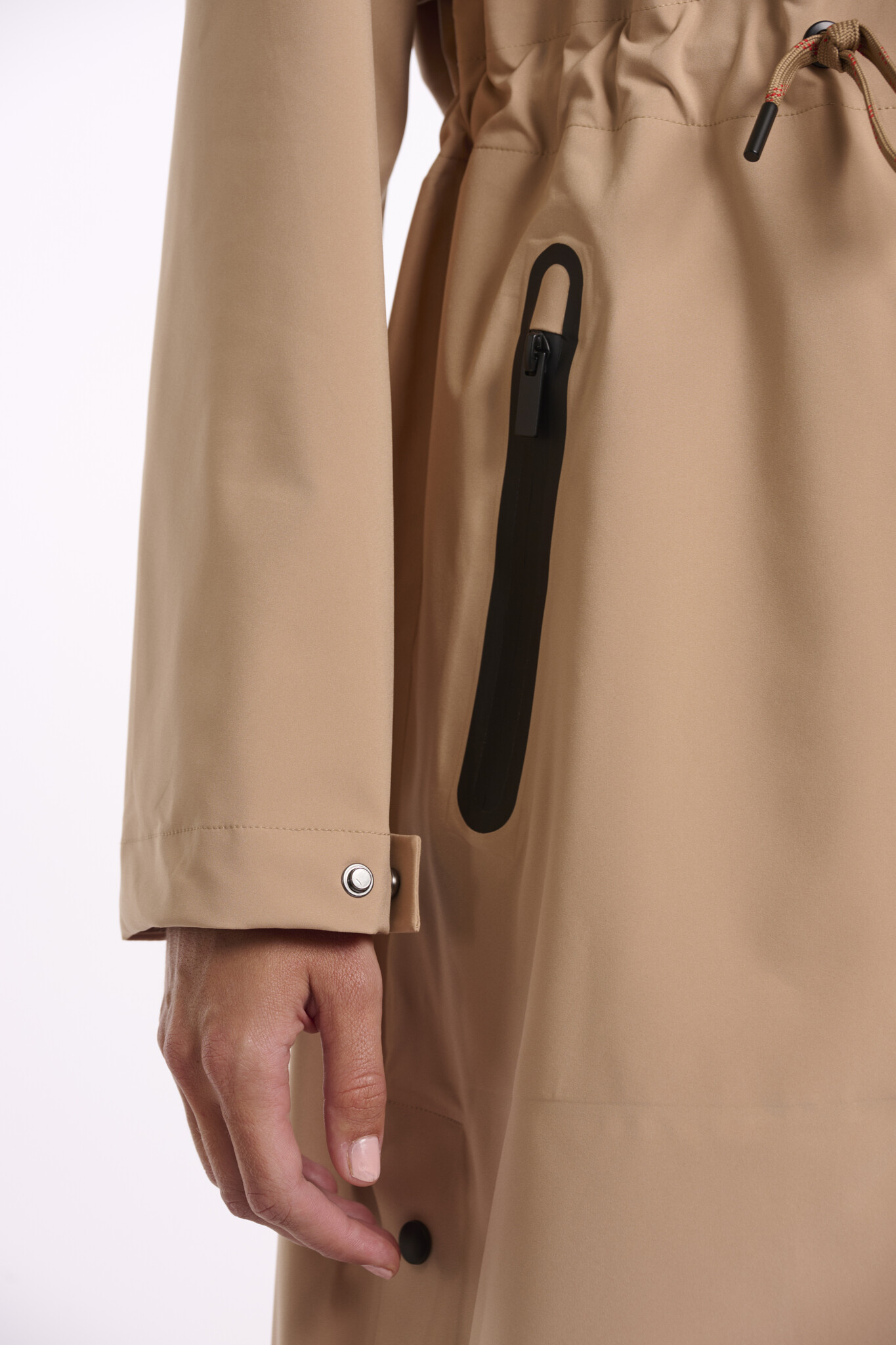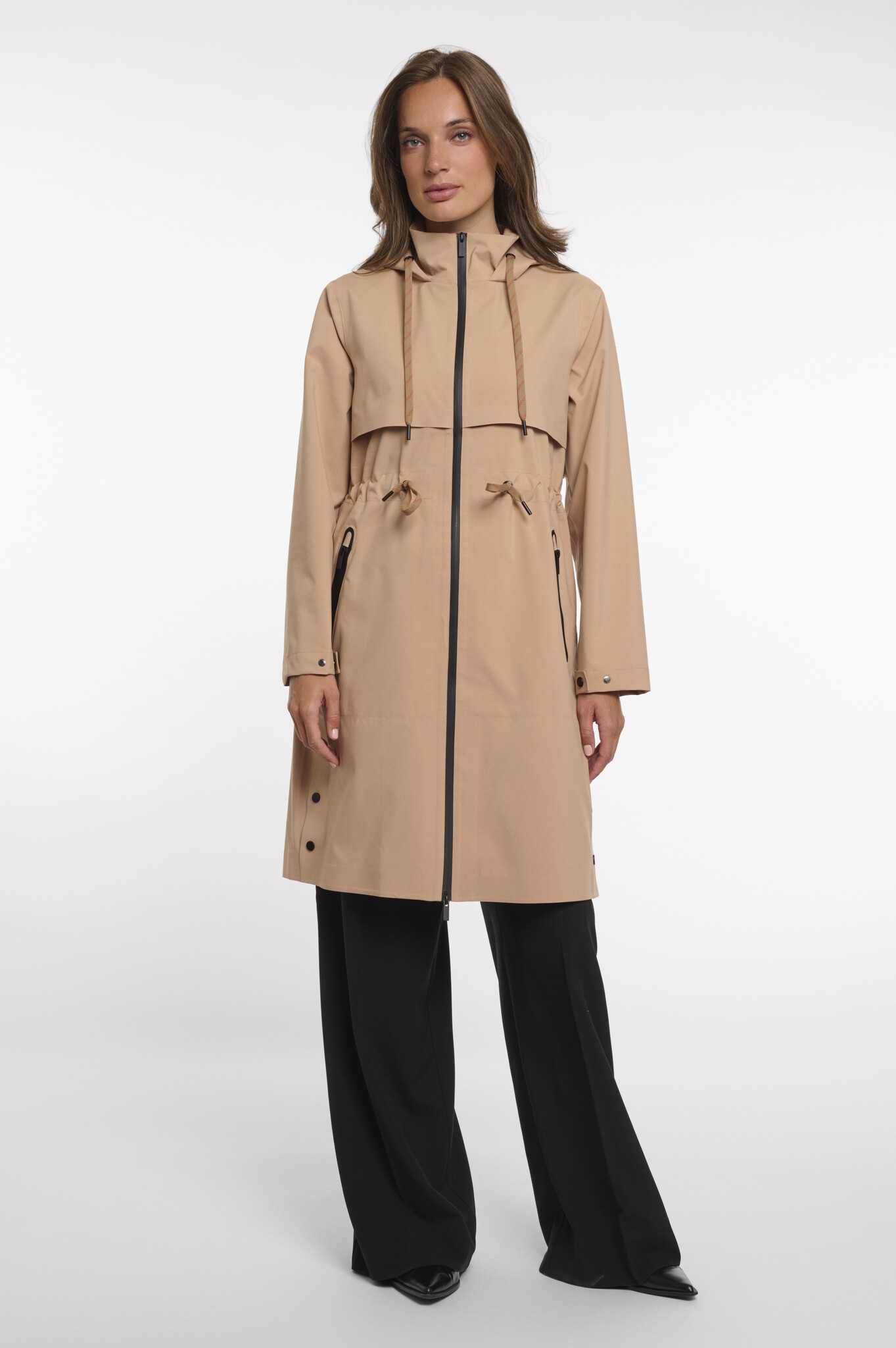 Stay chic even on rainy days with this long raincoat, designed with a sleek zip-front closure, a protective wind flap, and an adjustable drawstring waist for a refined silhouette. Functional zip pockets and a hood add practical ease, while button details at the hem allow the coat to be worn more open or closed. Buttoned cuffs complete the design, offering extra wind protection without compromising its clean, elegant look.