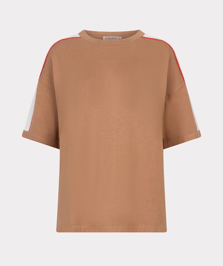 Soft, fine-knit sweater with half sleeves and a continuous stripe across the shoulders. The sweater is made from 78% viscose and 22% nylon.