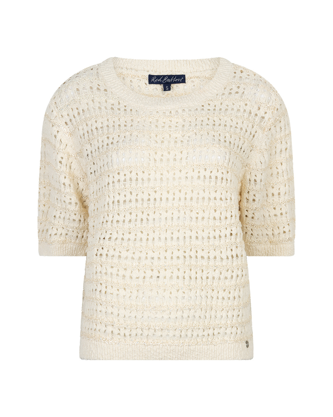 The Jolene is a coarsely knitted top of a soft quality with a round neck. The top has a ribbed hem at the neck, sleeves and at the bottom. The Jolene has short puff sleeves.