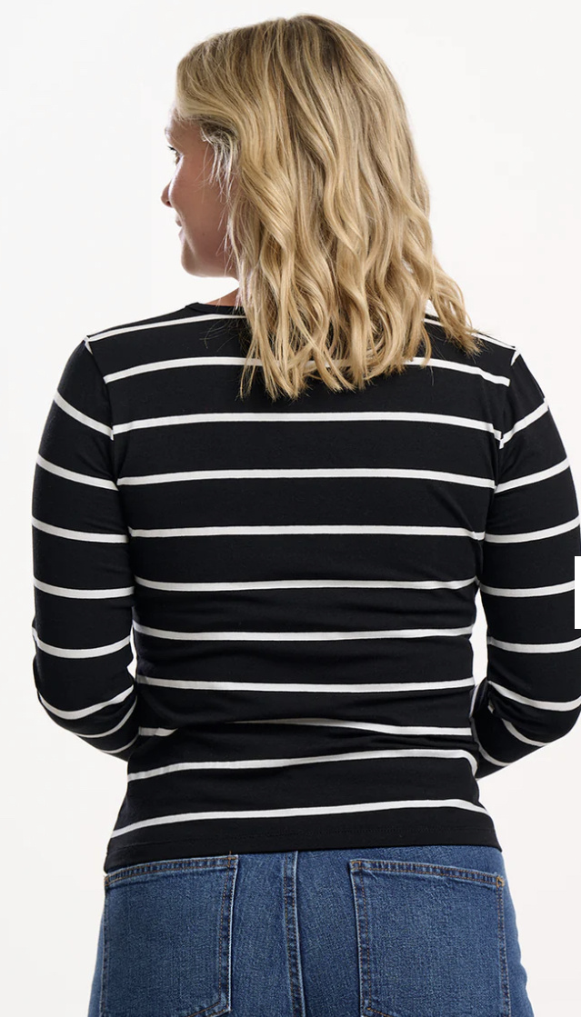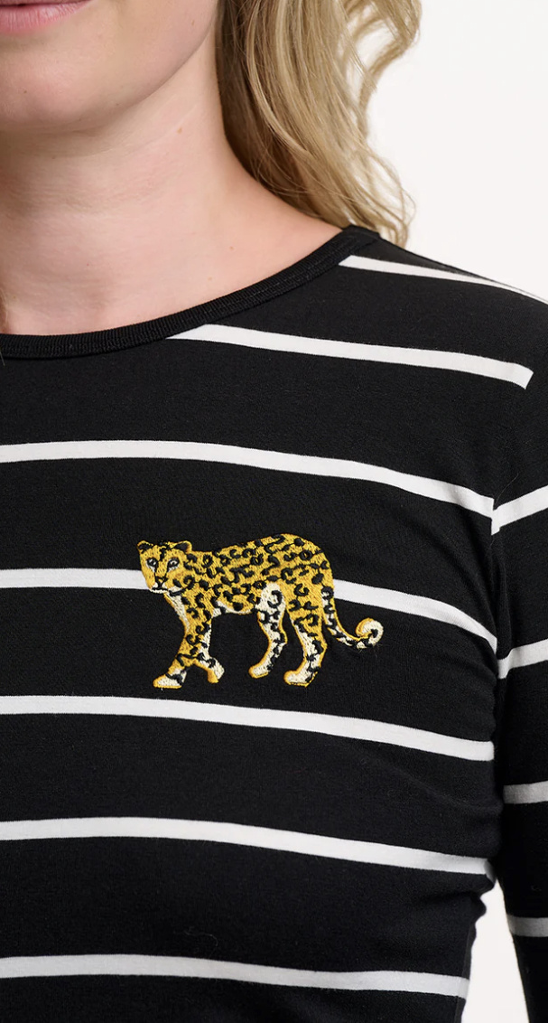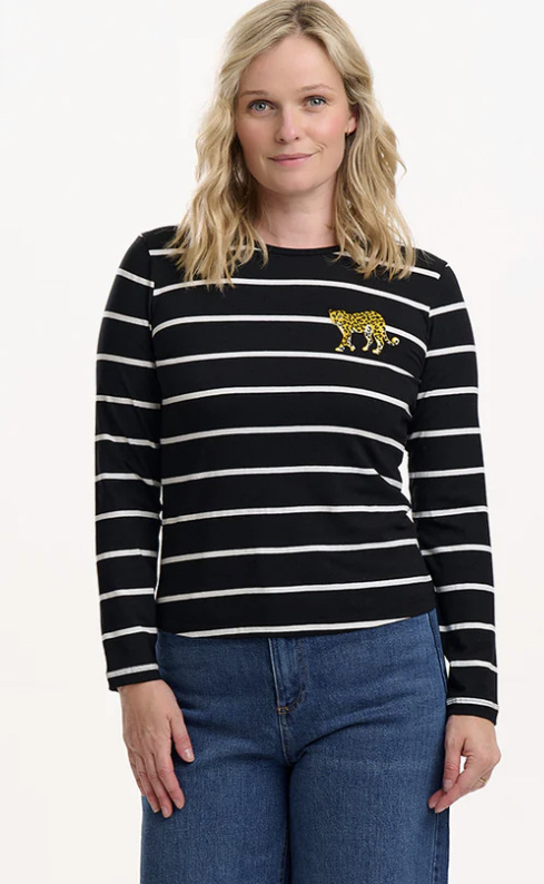 Refresh your wardrobe with the Josie Jersey Top in black and white stripe. Featuring high-contrast, white horizontal stripes on a black base, this long-sleeve top offers a clean, modern take on classic Breton style. The highlight of this top is the embroidered leopard on the bust. Crafted from soft, breathable jersey fabric, it’s perfect for layering or wearing solo for effortless everyday style. Pair with jeans for a casual weekend look.