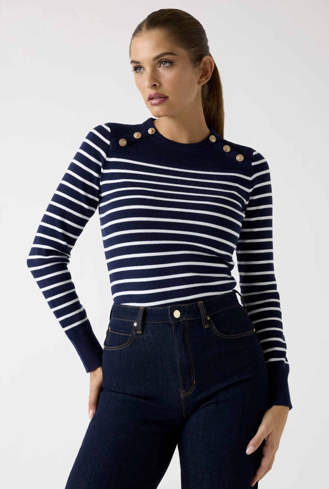 Decorative buttons at the shoulders.
